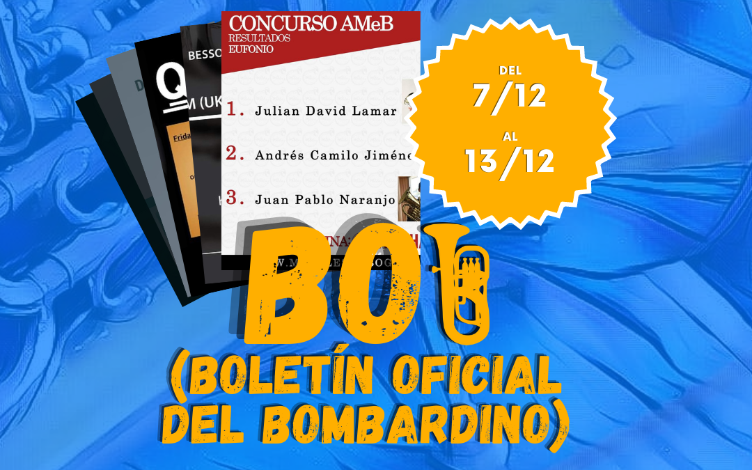 Se hacen públicos los 3 ganador@s del concurso organizado por la Academia de Metales de Bogotá, entre los que encontramos a los bombardinistas Julián David Lamar como ganador del concurso, Andrés Camilo Jiménez como segundo premiado y Juan Pablo Naranjo en tercer lugar. Enhorabuena a los ganadores.