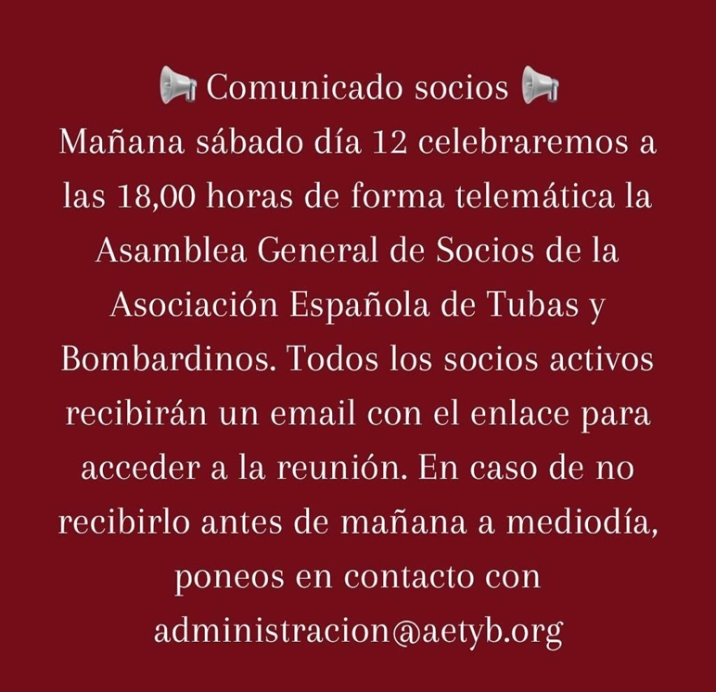 La Asociación Española de Tubas y Bombardinos convoca su asamblea general de socios para el Sábado 12 de Diciembre a las 18:00 de manera telemática.