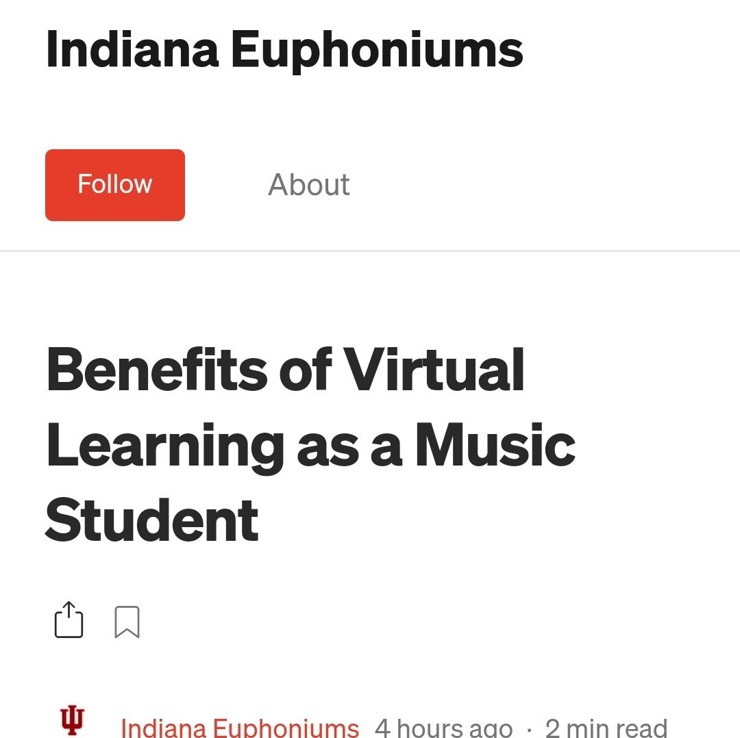 Disponible en la página web del Euphonium Studio de la Indiana University: el artículo «Benefits of Virtual Learning as a Music Student«, escrito por Josh Bishop y que versa sobre los beneficios del Aprendizaje Virtual siendo un estudiante de música.