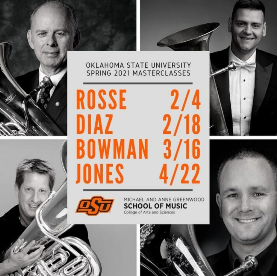 OSU Tuba/Euphonium Studio presenta l@s artistas del bombardino que impartirán masterclasses durante la primavera: Brian Bowman, Hiram Díaz y Brandon Jones.