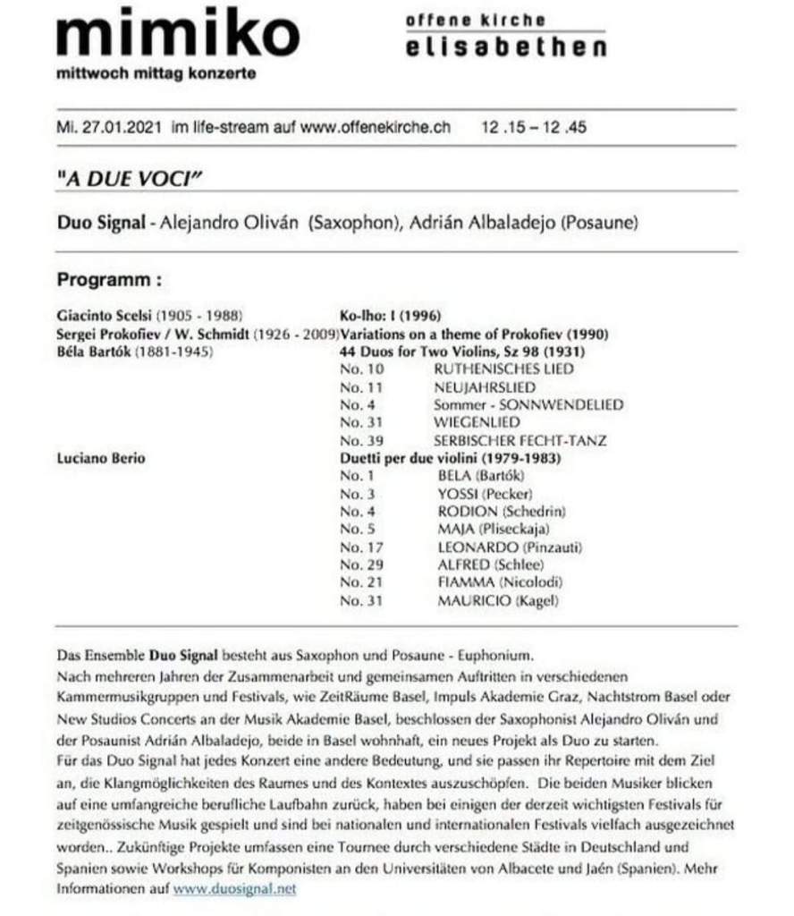 Concierto gratuito en Streaming en la página de Duosignal. Bombardinista: Adrián Albaladejo.
