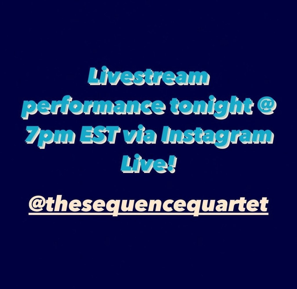 Concierto en Streaming en el perfil de Instagram del Sequence Quartet a cargo de Andrew Sallee, Jack Lorens, Josh Bishop y Ben Horne en el cual interpretaron el Tango Divertido, compuesto por este ultimo integrante.