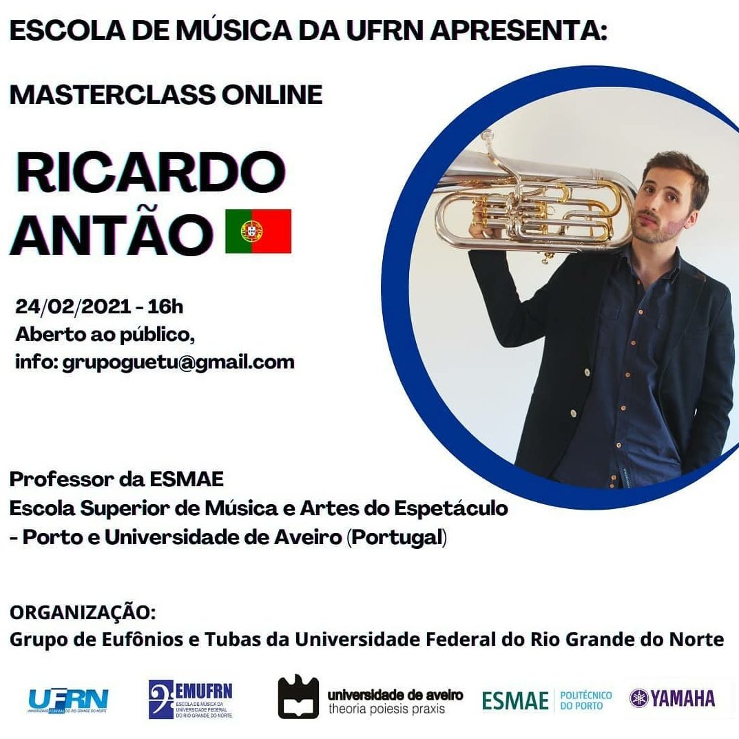 GuêTu (@grupoguetu en Instagram) y la Escuela de Música de la Universidad Federal de Rio Grande do Norte invitarón a toda la comunidad a una Masterclass en línea, que fue impartida por el profesor Ricardo Antão, residente en la ESMAE – Porto y Universidad de Aveiro (Portugal). Ricardo habló sobre sus experiencias en la enseñanza de los instrumentos de viento-metal en Europa y sobre la interpretación artística.