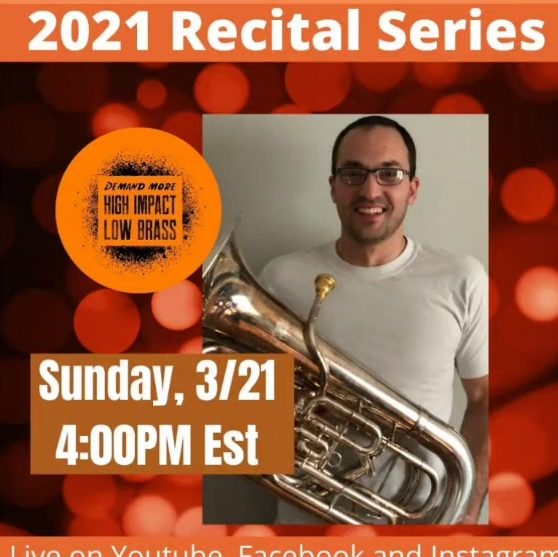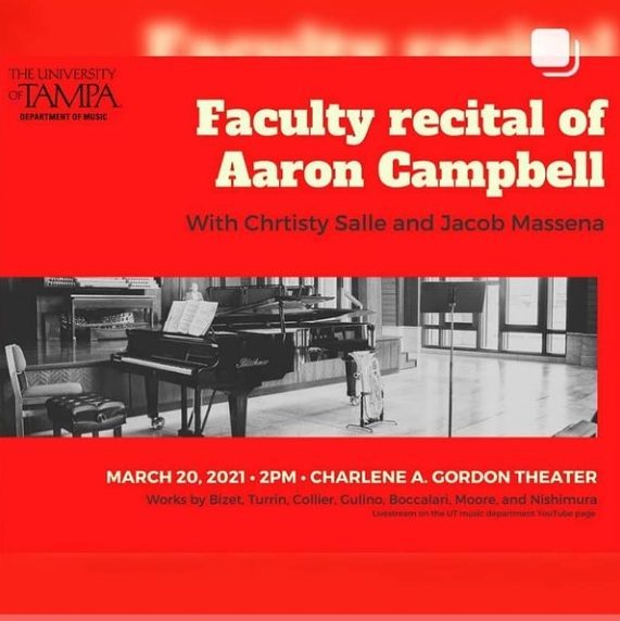 El sábado a las 19:00 pudimos disfrutar del recital de Aaron Campbell, bombardinista junto a la colaboración de Chrtisty Salle y Jacob Massena interpretando obra de Bizet, Turrin, Collier, Coller, Gulino, Boccalari, Moore y Nishimura. Retransmitido a través del canal de Youtube del departamento de música de la universidad de Tampa.
