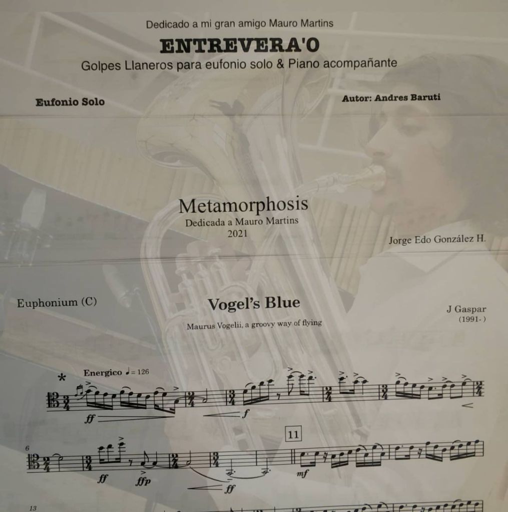 El solista internacional Mauro Martins publicó en sus redes sociales una serie de obras dedicadas a él. Las obras son «Entrevera’o» para Bombardino y piano de Andres Baruti, «Metamorphosis» de Jorge Edo Gonzalez y «Vogel’s Blue» de J. Gaspar.