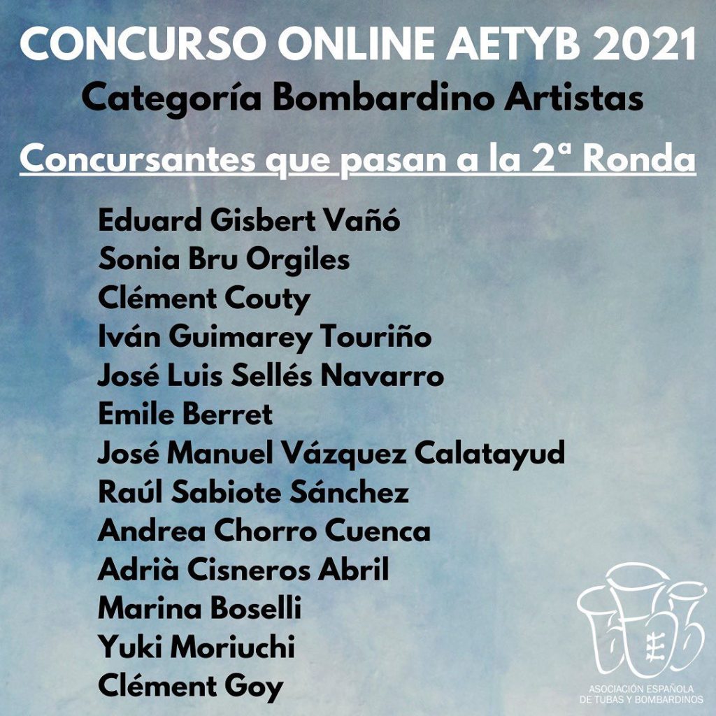 La Asociación Española de Tubas y Bombardinos hizo pública la lista de participantes que lograron pasar a la segunda ronda de la categoría correspondiente a mayores de 18 años «Bombardinos artistas».