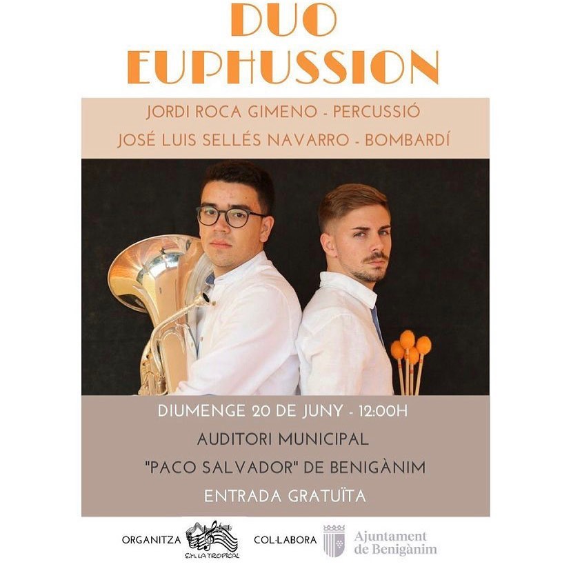 El Domingo día 20 de Junio tuvo lugar el concierto del dúo Euphussion formado por el bombardinista José Luis Sellés y el percusionista Jordi Roca. El evento tuvo lugar en el Auditorio «Paco Salvador» de Beniganim (Valencia) a las 12:00h.