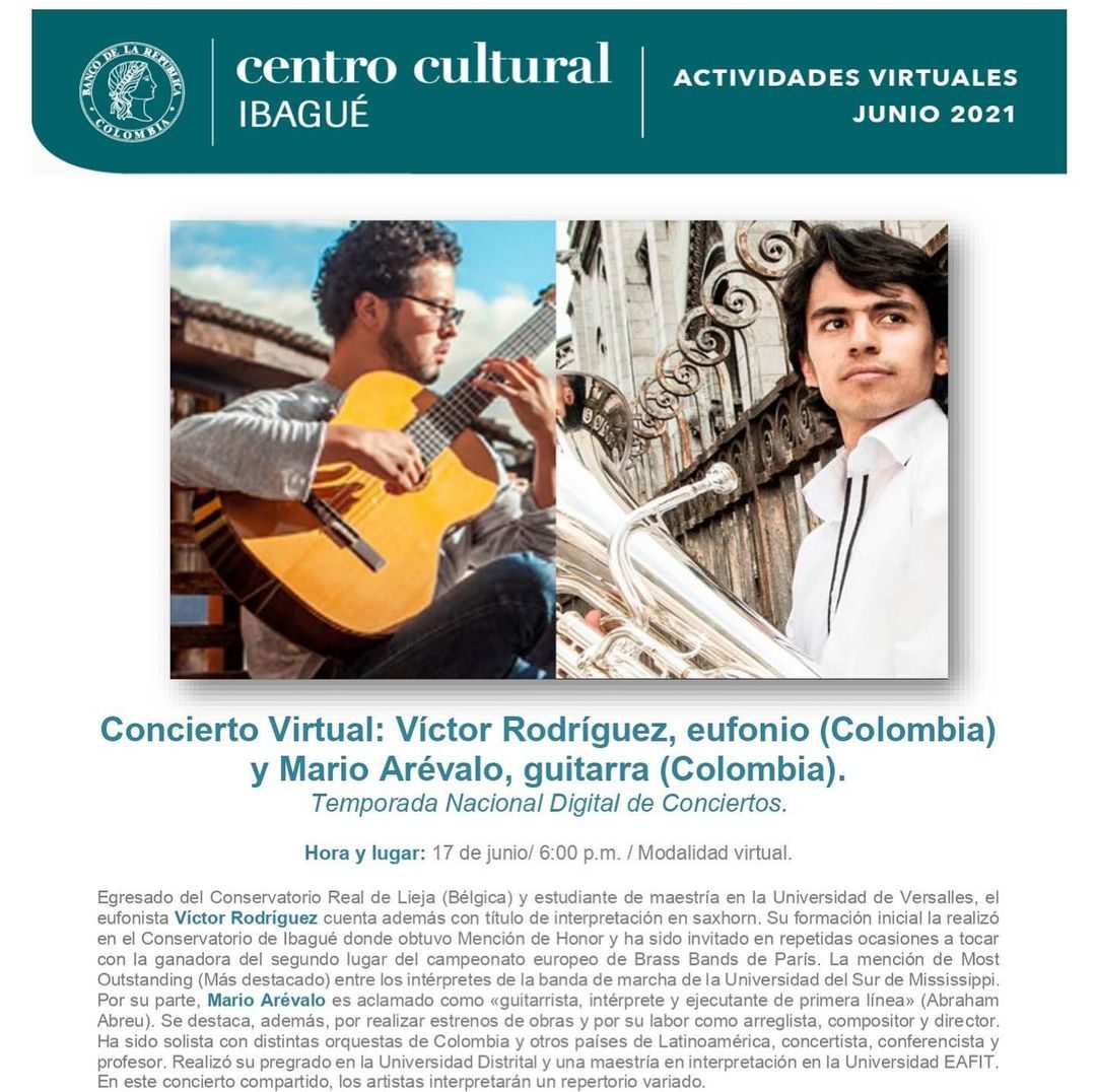 El bombardinista colombiano Victor Rodríguez junto al guitarrista Mario Arévalo, dieron un concierto virtual el pasado 17 de Junio. La retransmisión tuvo lugar a las 6:00pm (Colombia) a través de las redes sociales del Banco de la República de Colombia.