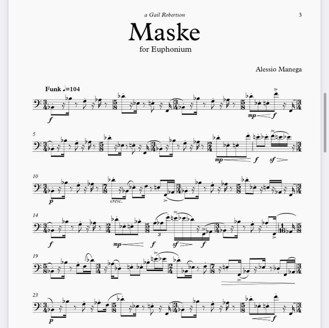 Maske es una suite para bombardino solo compuesta por Alessio Manega. Consta de tres piezas dedicadas a la bombardinista estadounidense Gail Robertson. Se trata de una suite muy técnica pero a la vez muy musical, para poner a prueba las habilidades técnicas del intérprete.