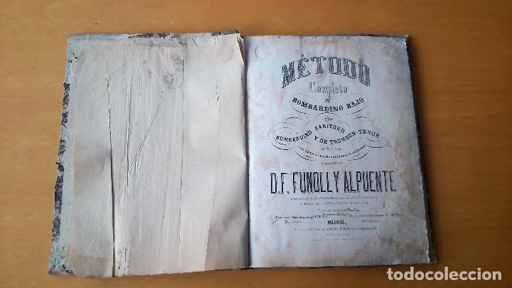 Su autor fue 𝗙𝗿𝗮𝗻𝗰𝗶𝘀𝗰𝗼 𝗙𝘂𝗻𝗼𝗹𝗹 𝘆 𝗔𝗹𝗽𝘂𝗲𝗻𝘁𝗲 (1795-1859), Caballero de la Real Orden Americana de Isabel la Católica y Músico Mayor del Reglamento Infanta de Toledo nº 35. Según sus propias palabras recogidas en el Prólogo, escribió este método por su propio deseo de hacer algo en beneficio del arte que profesaba, para instruir teórica y prácticamente a la juventud estudiosa y especialmente porque el Bombardino se venía aprendiendo y enseñando en aquella época sin más auxilio que el instinto y las especiales dotes que Dios había concedido a los españoles para la música, ya que ningún método se había publicado en castellano hasta la fecha, y si algunos habían circulado en idiomas extranjeros, estos habían sido tan raquíticos e incompletos que sólo habían servido para enseñar las posiciones de su escala general. Según el portal de datos bibliográficos de la Biblioteca Nacional de España, el «Método completo de Bombardino Bajo, de Bombardino Barítono y de Trombón Tenor en Do o Sib, con tres o cuatro cilindros o pistones» fue publicado en Madrid en el año 1862 y fue propiedad del conocido editor Antonio Romero, quien lo guardaba para su venta en su Almacén de Música e Instrumentos ubicado en la calle de Preciados, nº 1 de la misma ciudad. El método, planteado de forma progresiva y con matices que diferenciaban los Instrumentos en Do y en Si b, cubre diversos aspectos técnicos y prácticos del estudio del 𝗕𝗼𝗺𝗯𝗮𝗿𝗱𝗶𝗻𝗼 tales como: