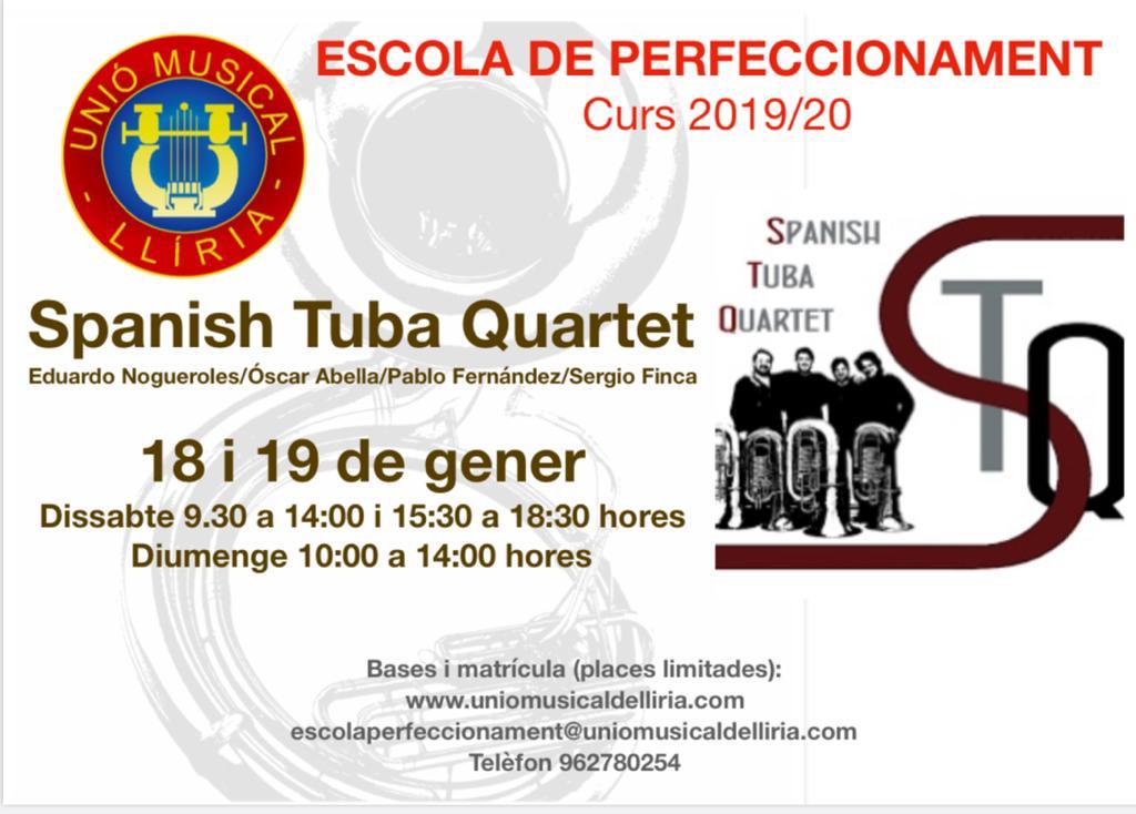 Encuentro Tuba 18 y 19 de Enero del 2020 precio encuentro: 75€ DESARROLLO DE LAS CLASES: Sábado *Calentamiento 10:00-11:00 *Individuales (las clases individuales serán impartidas cada una por dos miembros del Cuarteto) 11:30-12:00 12:00-12:30 12:30-13:00 13:00-13:30 13:30-14:00 *Música de Cámara 15:30-18:30 Domingo *Calentamiento 10:00-11:00 *Individuales (las clases individuales serán impartidas cada una por dos miembrosSigue leyendo «Spanish Tuba Quartet»