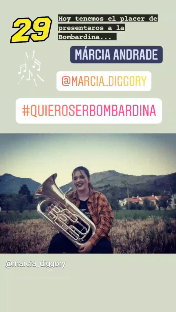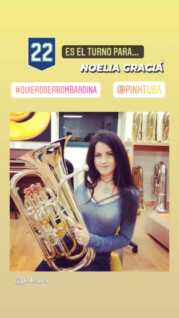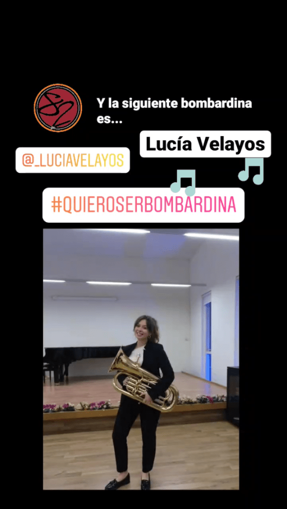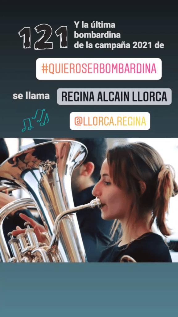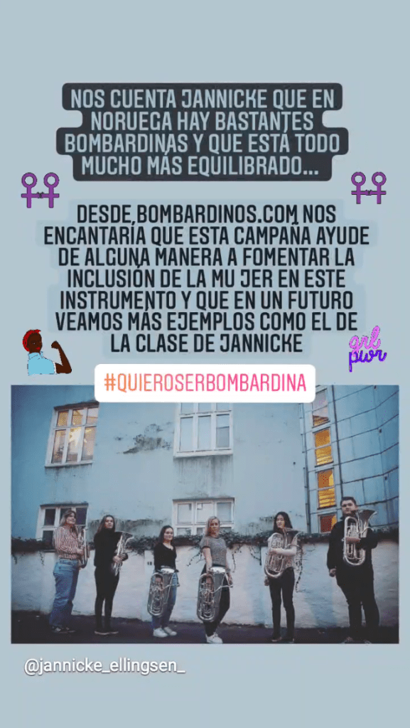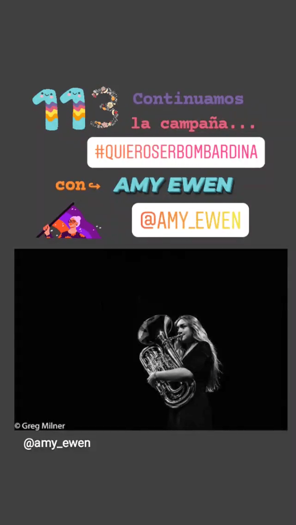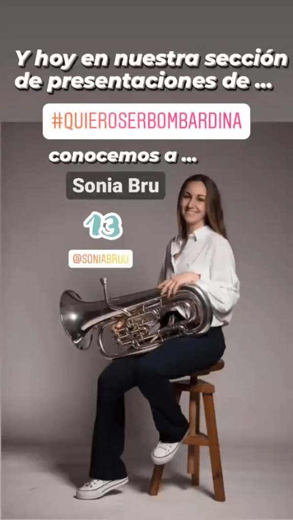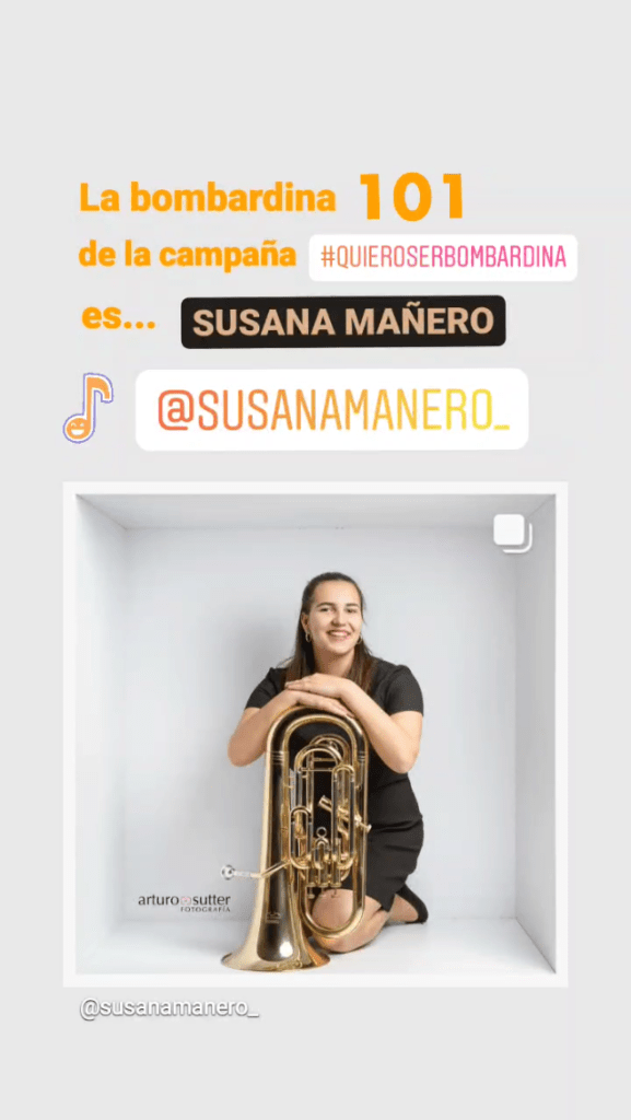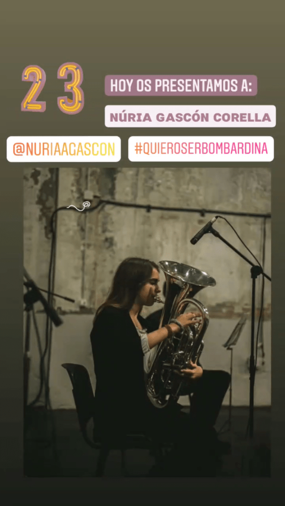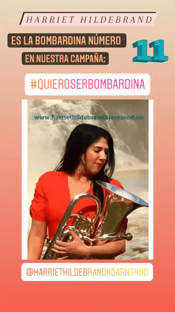 La estrategia principal de la campaña radica en la difusión y promoción en RRSS de mujeres de cualquier parte del mundo que toquen el bombardino. Desde el 8 de enero hasta el 8 de marzo, nuestras RRSS compartirán diariamente fotos y vídeos de mujeres «bombardinas» con el objetivo de fomentar la inclusión de la mujer en este instrumento, visibilizar su papel, reivindicar que no son una excepción en el sector y que son modelos a seguir para las futuras generaciones de mujeres bombardinistas.
