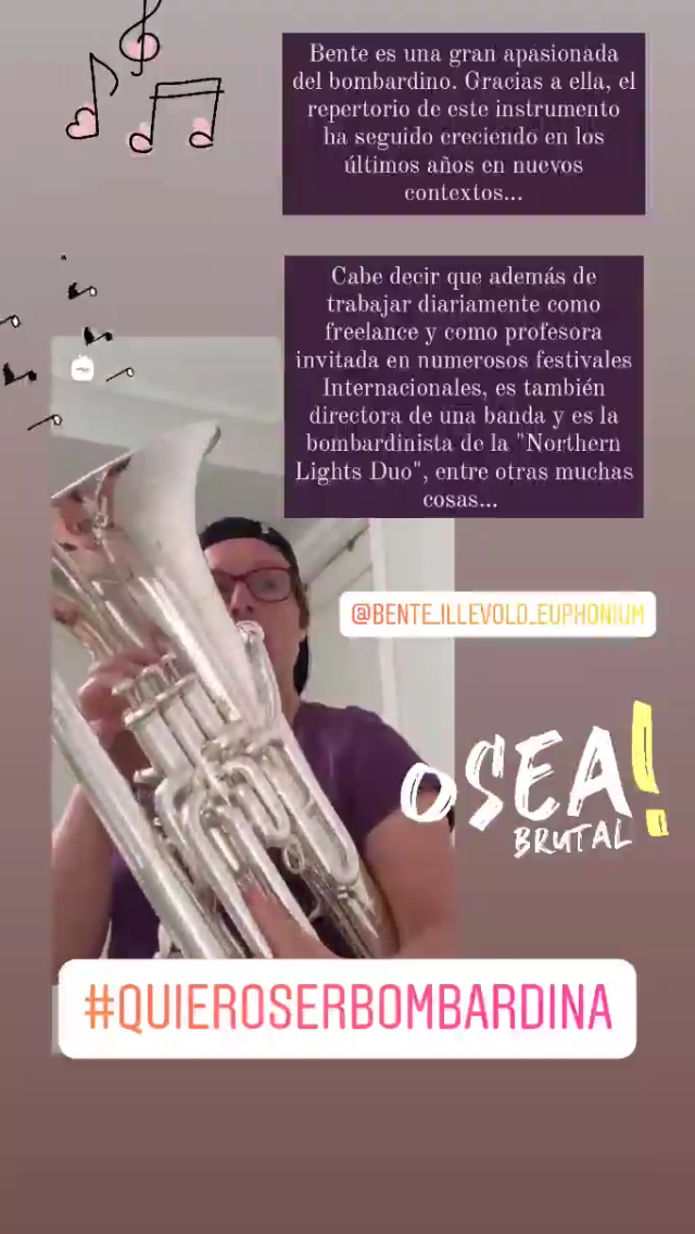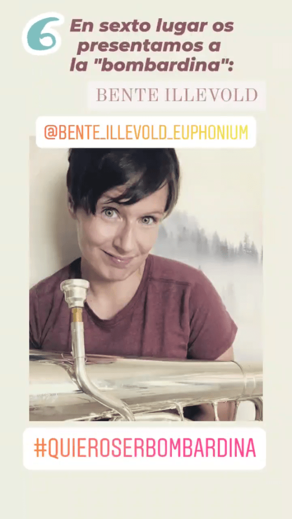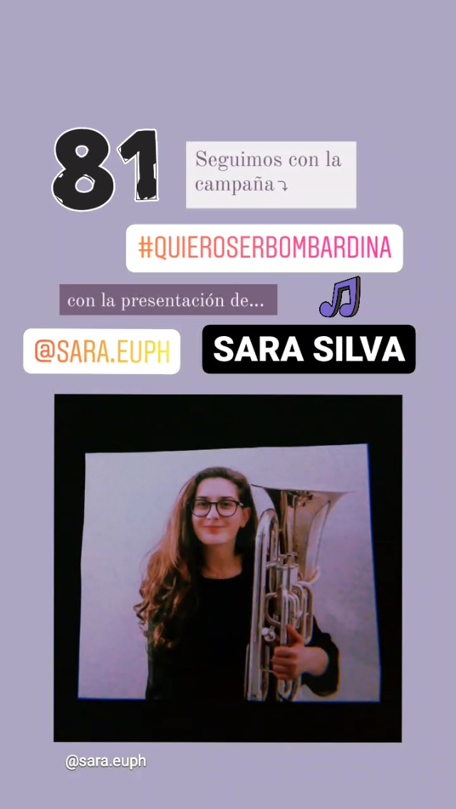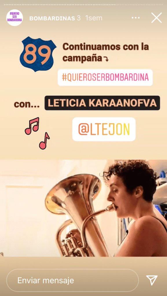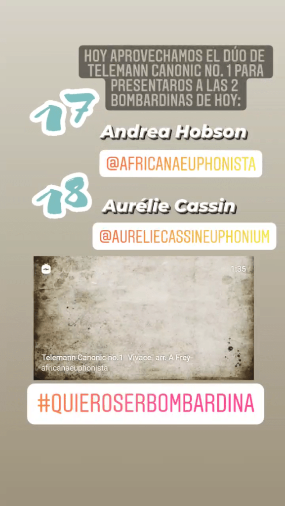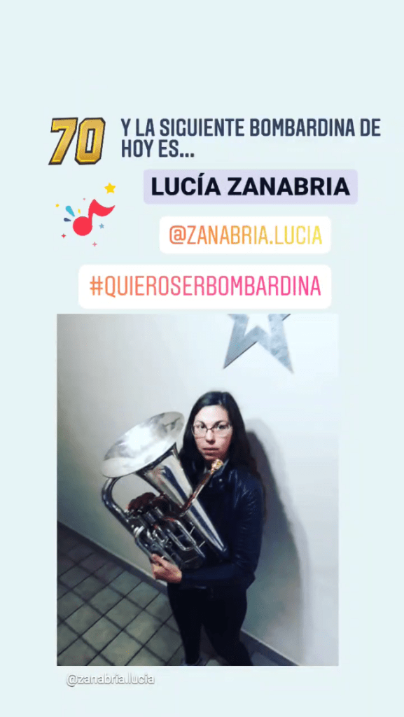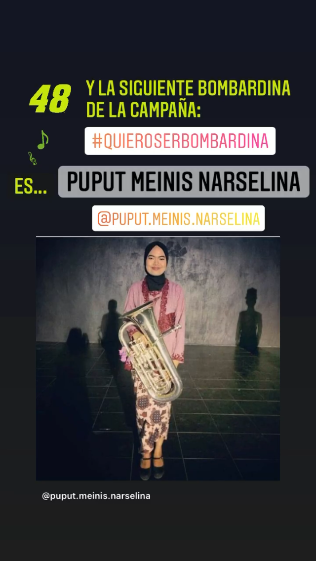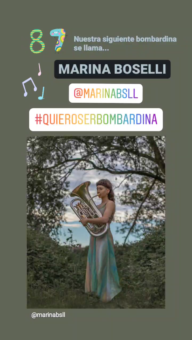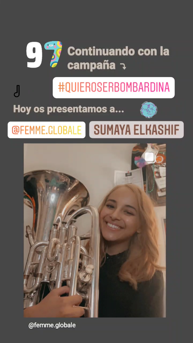 La estrategia principal de la campaña radica en la difusión y promoción en RRSS de mujeres de cualquier parte del mundo que toquen el bombardino. Desde el 8 de enero hasta el 8 de marzo, nuestras RRSS compartirán diariamente fotos y vídeos de mujeres «bombardinas» con el objetivo de fomentar la inclusión de la mujer en este instrumento, visibilizar su papel, reivindicar que no son una excepción en el sector y que son modelos a seguir para las futuras generaciones de mujeres bombardinistas.