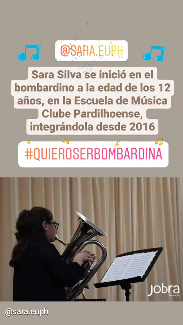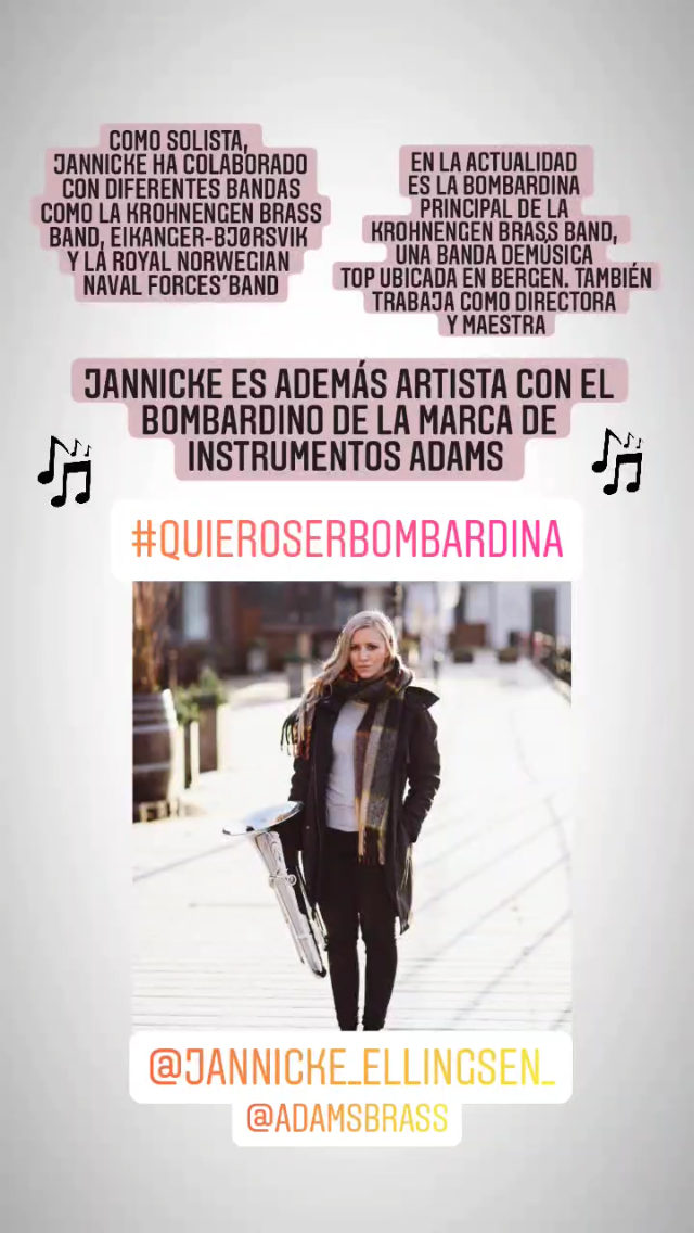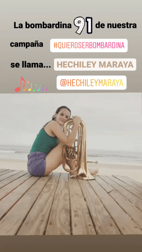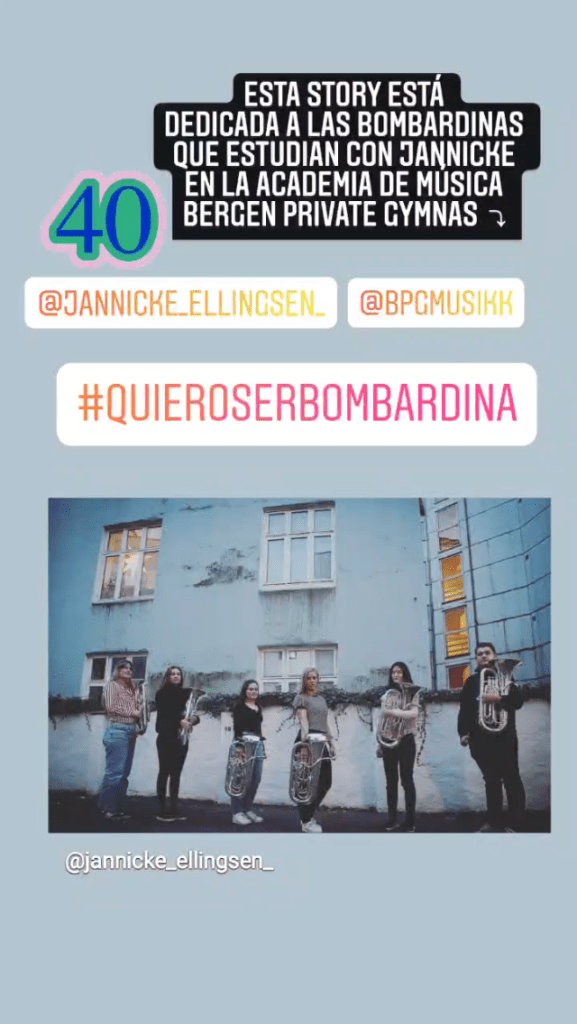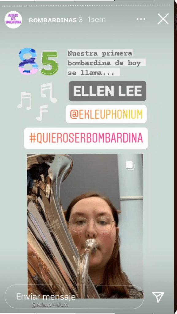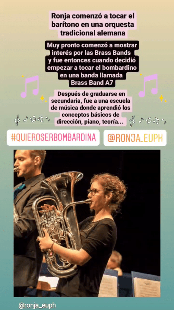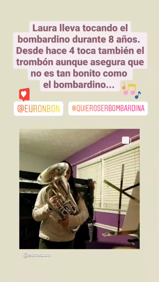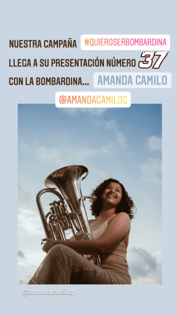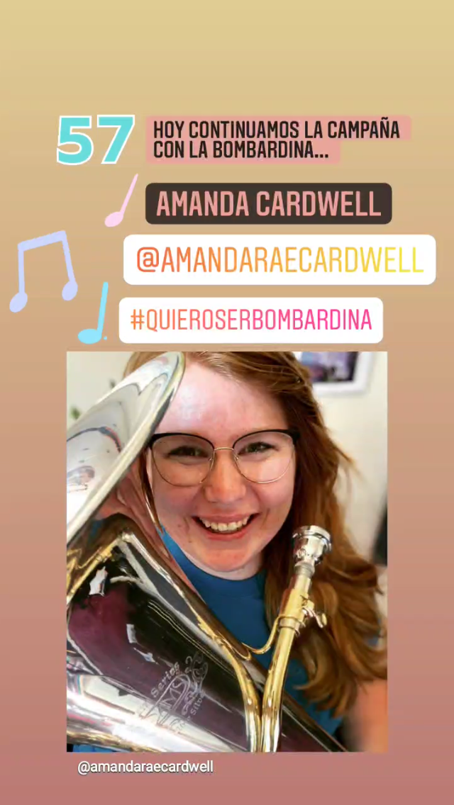 La estrategia principal de la campaña radica en la difusión y promoción en RRSS de mujeres de cualquier parte del mundo que toquen el bombardino. Desde el 8 de enero hasta el 8 de marzo, nuestras RRSS compartirán diariamente fotos y vídeos de mujeres «bombardinas» con el objetivo de fomentar la inclusión de la mujer en este instrumento, visibilizar su papel, reivindicar que no son una excepción en el sector y que son modelos a seguir para las futuras generaciones de mujeres bombardinistas.