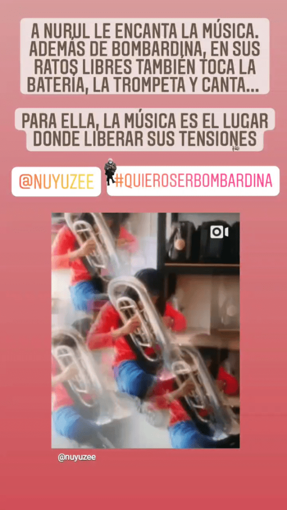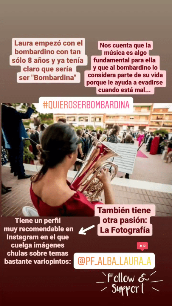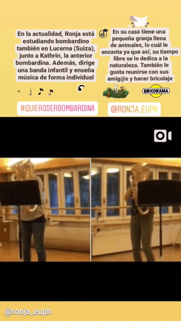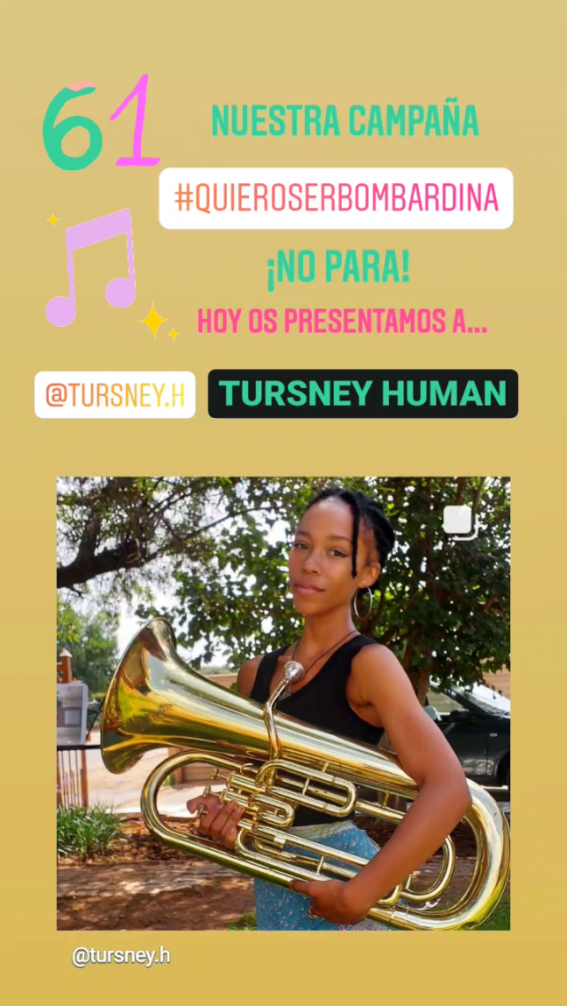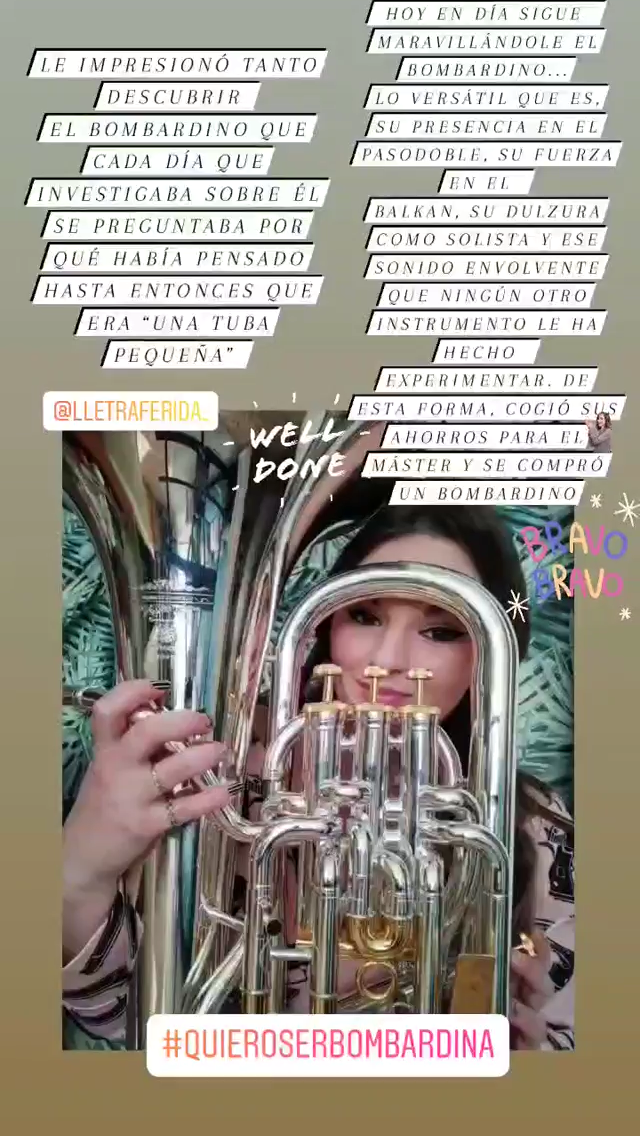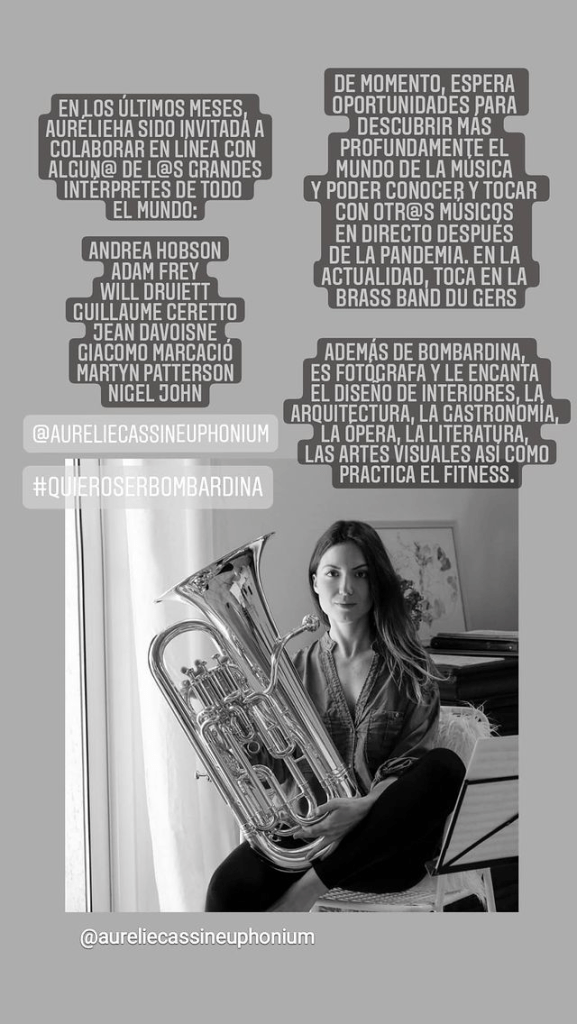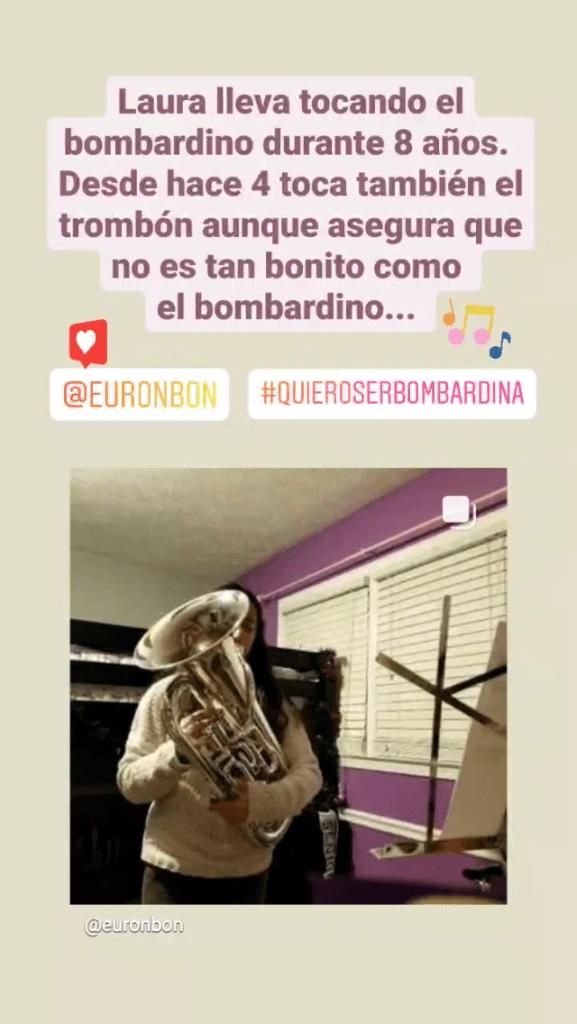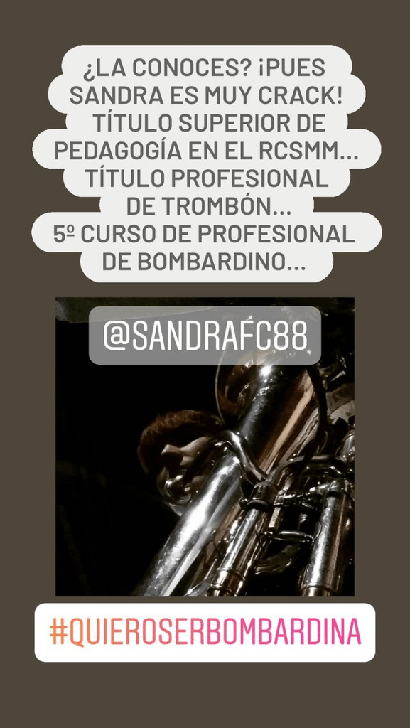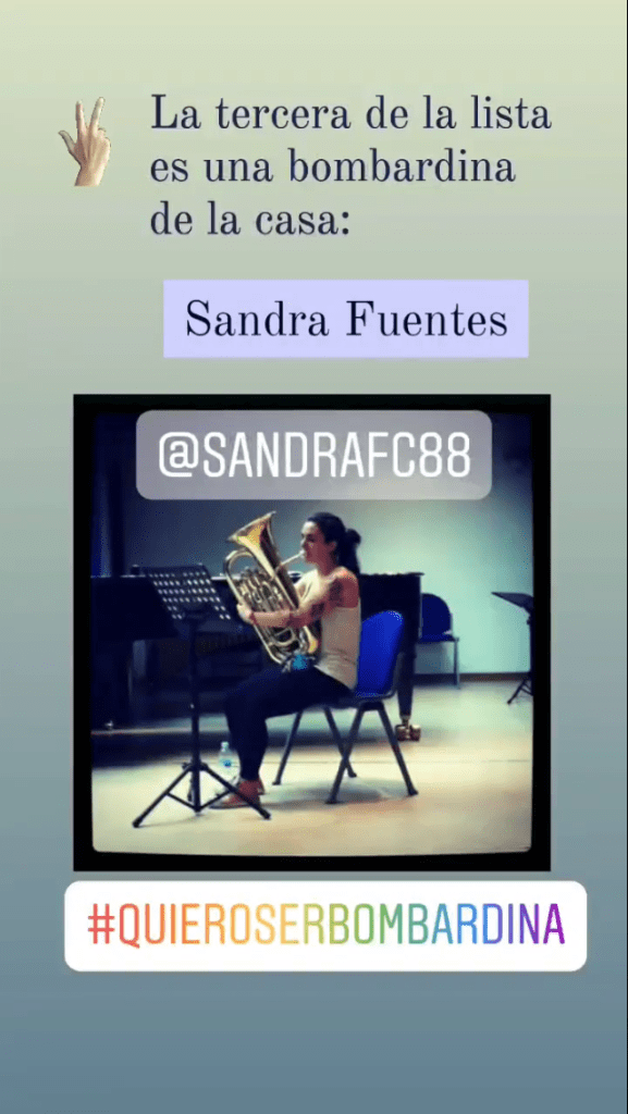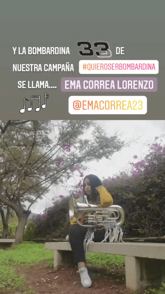 La estrategia principal de la campaña radica en la difusión y promoción en RRSS de mujeres de cualquier parte del mundo que toquen el bombardino. Desde el 8 de enero hasta el 8 de marzo, nuestras RRSS compartirán diariamente fotos y vídeos de mujeres «bombardinas» con el objetivo de fomentar la inclusión de la mujer en este instrumento, visibilizar su papel, reivindicar que no son una excepción en el sector y que son modelos a seguir para las futuras generaciones de mujeres bombardinistas.